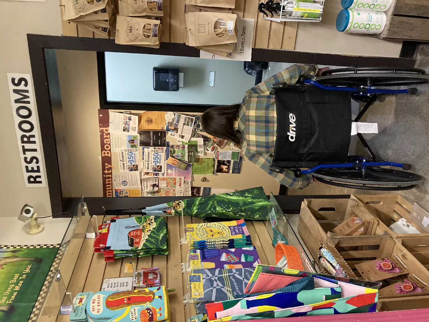 Ramp: Easy grade ramp leads up to entrance. Entrance: Manual double doors open out. Difficult to open. 2 inch bump covered by mat. Interior: Narrow aisles throughout market. Aisles is wide enough for manual and not power chairs. Counter: Is at chest level. . Restroom: Opens in. Difficult to open. Stall has adequate space for wheelchair.. Some HC amenities. Users Comments: Parking located about 100 ft from ramp to store. Small 2 inch bump covered by mat near entrance. Isles are narrow. Was still possible to navigate. Exit door is heavy. Where To Wheel Accessibility RatingOverall Rating: (2.8)