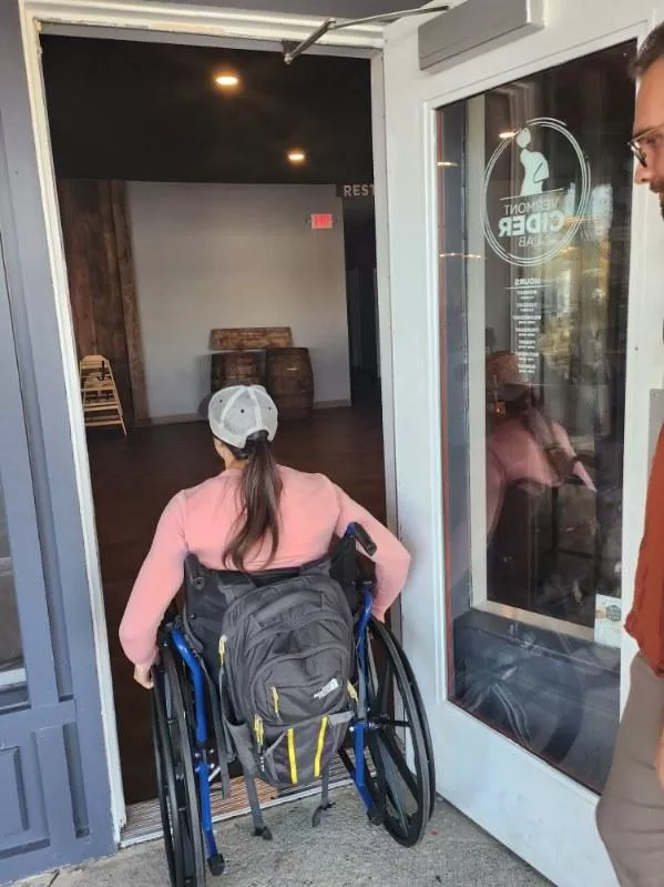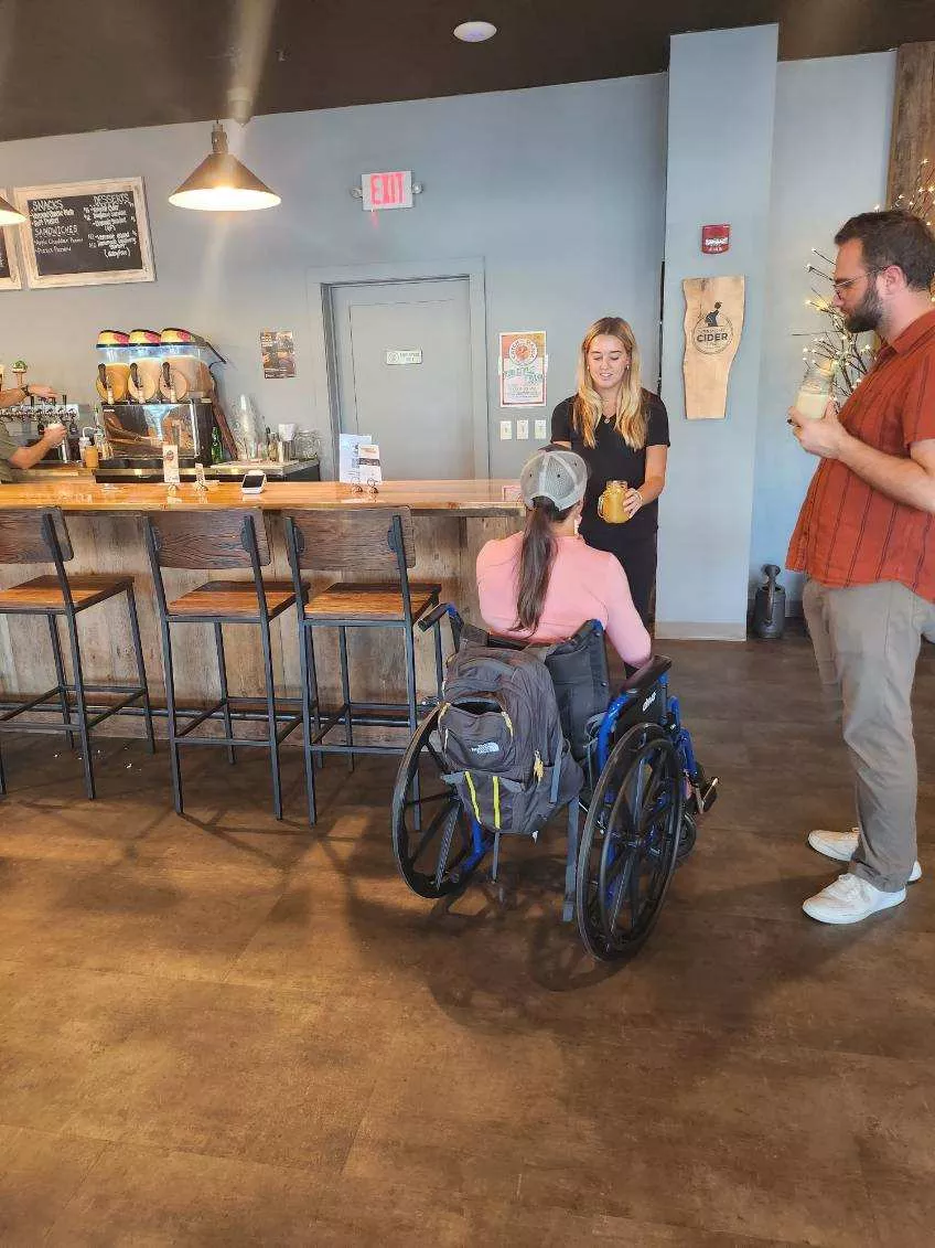 Parking: In front parking lot. Entrance: Single door entrance opens out. Very heavy and difficult to open. Wide open when warm out. Seating: High tops inside. Some low tops. Plenty of accessible tables when you first come in. Patio: Plenty of low tables outside. Spaciousness: Adequate to spacious throughout restaurant. Bar has spacious aisle next to it. Restrooms: Doors opens in. Large accessible stall. Easy to open. Sink is eye level. Very accessible. Semi easy exit door. Mostly spacious in and out. Staff is very accommodating. User Comment: Entrance was difficult with the heavy manual door opening out but the venue is very spacious and easy to get around with plenty of seating. The order area is at a bar/high top but you do have the ability to order at your table online. Where To Wheel Accessibility RatingOverall Rating: (3.2)
